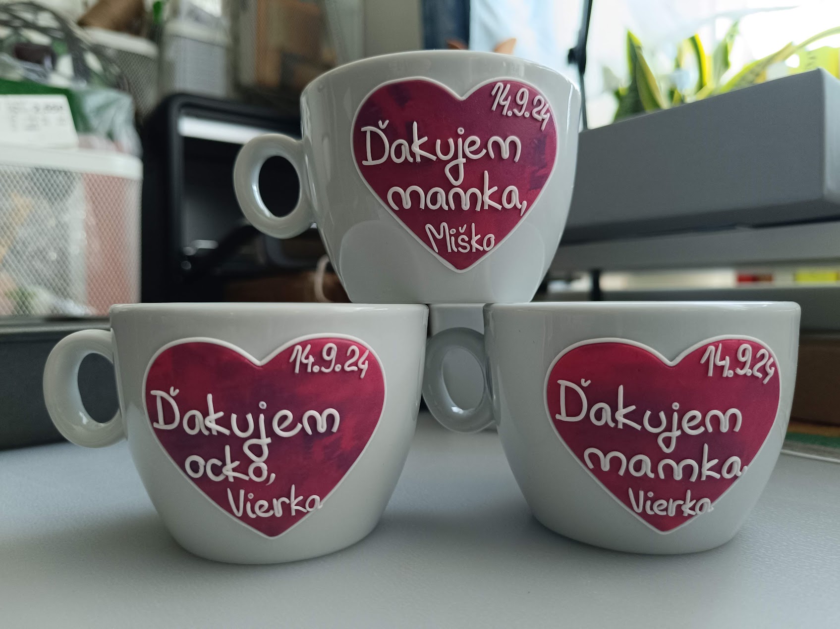 Plynulo sme pokračovali ďalej do Bratislavy na sestrinu svadbu, ktorá sa taktiež nemohla zaobísť bez daru. Tentokrát boli okrem mladomanželov odvarovaní aj rodičia, ktorí takto majú peknú spomienku na jej veľký deň. Keďže som tieto šálky urobila sestre ako dar pre našich rodičov, neviem čo im dám na tej mojej 😅.